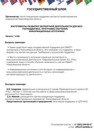 28 марта 2017 года в Новосибирске пройдет семинар по вопросам внешнеэкономической деятельности для малого и среднего бизнеса. Участники смогут узнать о законодательном регулировании и бухгалтерском учете валютных контрактов, а также о мерах государственной поддержки экспортеров. Семинар включает в себя выступления экспертов с многолетним опытом в сфере ВЭД, и участие бесплатное для зарегистрированных компаний.