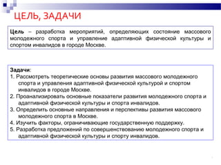 Документ освещает развитие массового молодежного спорта и управление адаптивной физической культурой и спортом инвалидов в Москве, включая теоретические основы, показатели, основные направления и факторы ограничивающие поддержку. Также предложены мероприятия по улучшению физического развития, модернизации инфраструктуры и организации физкультурных мероприятий для всех категорий жителей, включая инвалидов. Рассматриваются приоритеты и принципы, способствующие вовлечению инвалидов в физическую культуру и спорт.