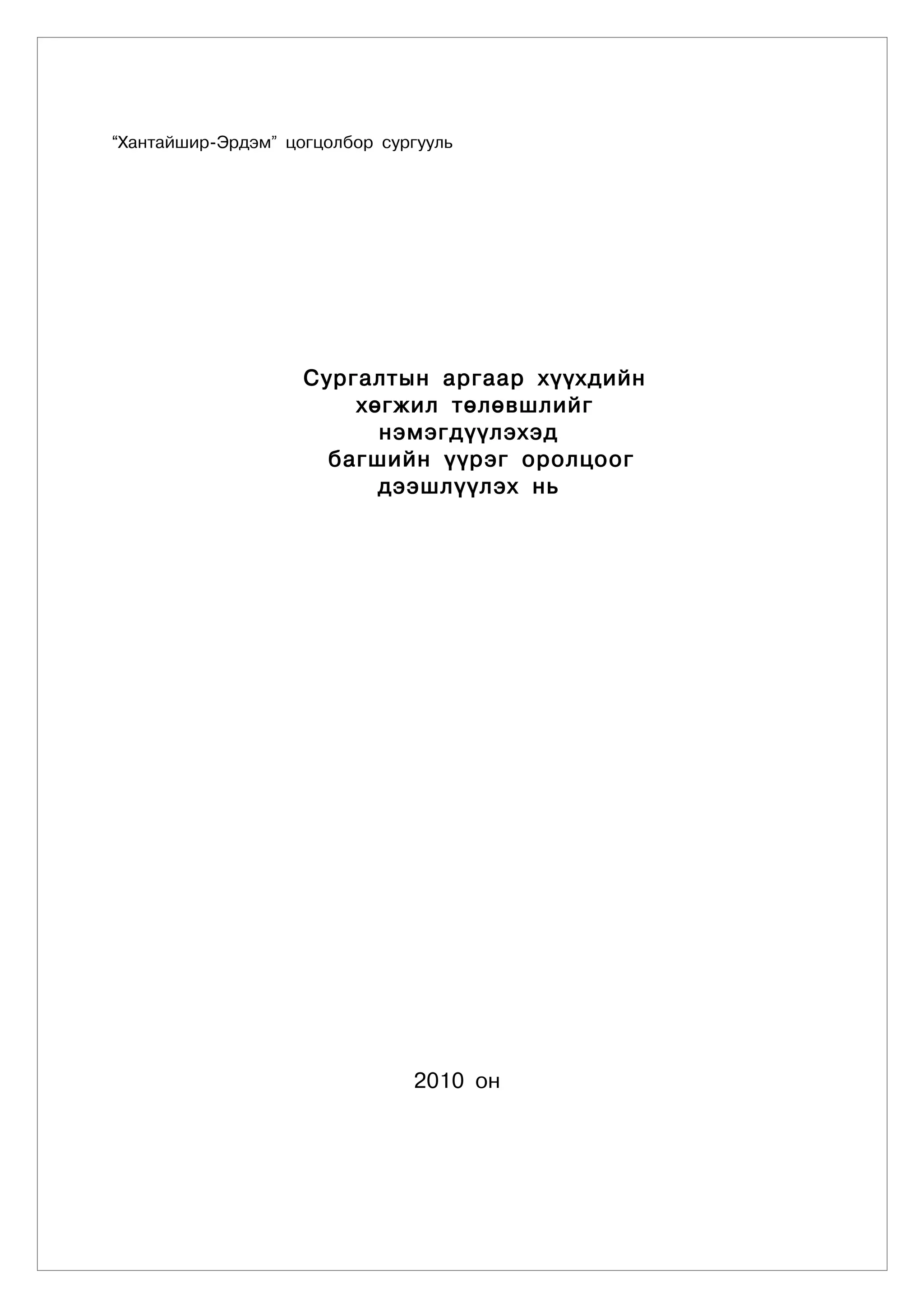 Áàãø òàíä õýðýãòýé çºâëºìæ-2 ÓÁ., 2009 2. Ö.Áààñàíäîðæ Ñóðàãëòûí àðãà ÓÁ .,2008 3. Áîëîâñðîë, ñî¸ë, øèíæëýõ óõààíû ÿàì Åðºíõèé áîëîâñðîëûí ñóðãóóëèéí 8 äóãààð àíãèéí ñóðãàëòûí òºëºâëºãºº , õºòºëáºð, çºâëºìæ ÓÁ.,2010 4. Ìàõìóò À÷ûë Ñóðãàí õ¿ì¿¿æ¿¿ëýã÷èéí áèåèéí õýë