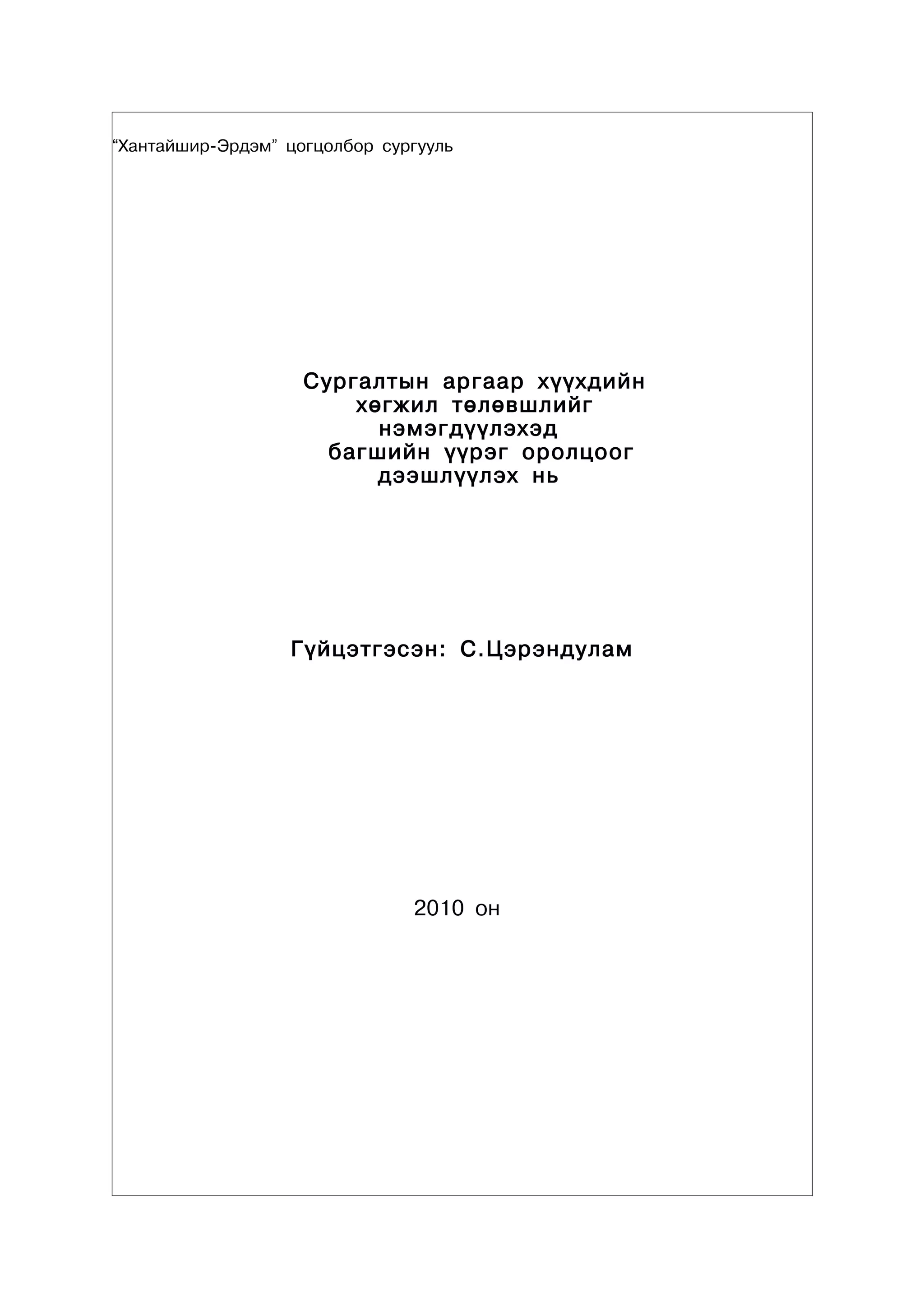 Сургалтын аргаар хүүхдийн хөгжил төлөвшлийг нэмэгдүүлэхэд багшийн үүрэг оролцоог дээшлүүлэх нь ÿéöýòãýñýí: Ñ.Öýðýíäóëàì 2010 îí