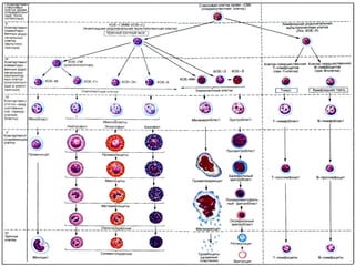 Документ описывает состав и функции крови и лимфы, включая виды клеток, участвующих в кроветворении и иммунных реакциях. Кровь выполняет транспортные, защитные, и гомеостатические функции, состоит из плазмы и форменных элементов, таких как эритроциты, лейкоциты и тромбоциты. Также рассматриваются различные формы и свойства клеток, участвующих в иммунитете и их роль в организме.
