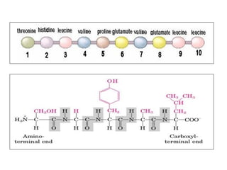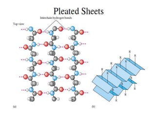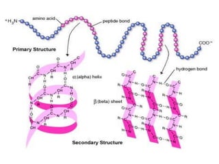 - Primary structure refers to the amino acid sequence in the polypeptide chain. Secondary structure involves hydrogen bonding that forms alpha helices or beta pleated sheets. Tertiary structure describes the overall 3D shape of the folded polypeptide chain. Quaternary structure involves the interactions between multiple polypeptide subunits. The document outlines the forces that stabilize protein structures such as disulfide bonds, hydrogen bonding, and hydrophobic interactions. Proteins are classified based on their composition, which can include modifications like glycoproteins, lipoproteins, or metal-binding groups.