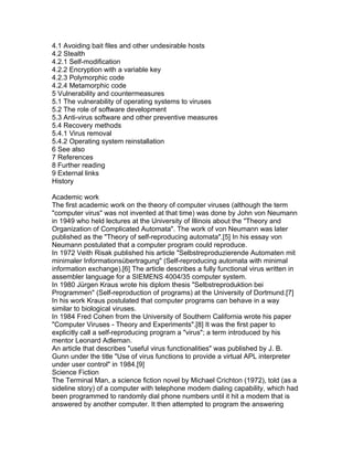 This document provides an overview of computer viruses, including their history and how they function. It defines viruses and differentiates them from other types of malware like worms and Trojan horses. It describes how viruses infect systems through executable files, boot sectors, and macros. It also outlines various infection strategies used by viruses and methods they employ to avoid detection, such as avoiding bait files, using stealth techniques, and polymorphism.