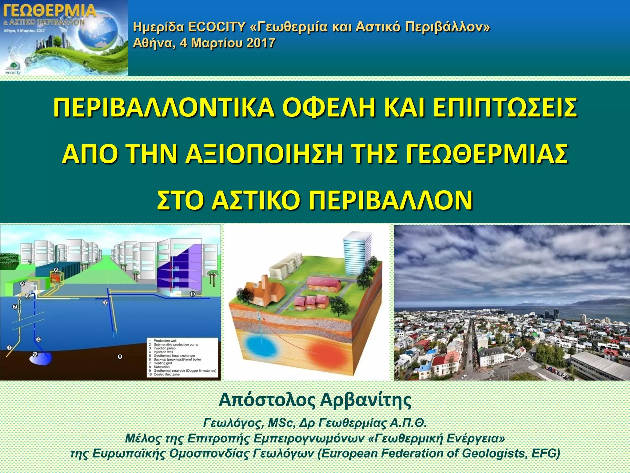 Εισήγηση του Απ. Αρβανίτη στην ημερίδα με θέμα "Γεωθερμία και Αστικό Περιβάλλον", που πραγματοποιήθηκε στις 4-3-2017 στο Εκθεσιακό Κέντρο MEC Παιανίας και διοργανώθηκε από τη ΜΚΟ Ecocity με τη συνεργασία του Συλλόγου Ελλήνων Γεωλόγων (ΣΕΓ).