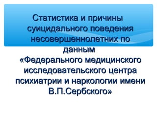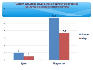 Документ анализирует статистику суицидального поведения среди несовершеннолетних в России, отмечая, что самоубийства занимают второе место среди причин смерти в возрастной группе 15-29 лет, с частотой, превышающей среднемировые показатели в 2,7 раза. Подробно рассматриваются характеристики суицидентов, способы совершения самоубийств и наличие предшествующих попыток, а также влияние цифровой среды на молодежь. В завершение изложены рекомендации по безопасному поведению в интернете для детей и подростков, акцентируя внимание на роли родителей и учителей в предотвращении суицидального поведения.