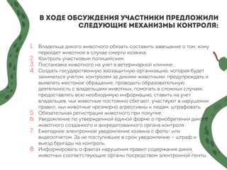 Документ содержит предложения по контролю за содержанием диких животных в многоквартирных домах, включая обязательную регистрацию, завещания владельцев, контроль ветеринаров и полицейских. В нем рассматриваются меры по предотвращению жестокого обращения с животными, введению лицензирования, созданию органов контроля и регистрации владельцев. Обсуждается необходимость защиты прав владельцев животных и создание единого закона о защите животных.