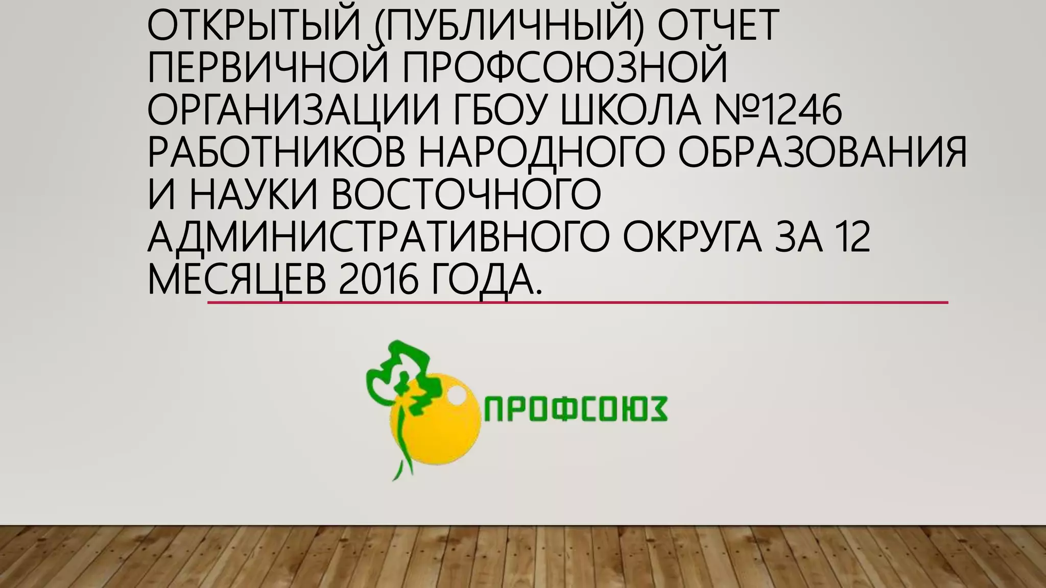 Доклад представляет отчет первичной профсоюзной организации ГБОУ школа №1246 за 2016 год, в котором освещаются различные аспекты работы профсоюза, включая организационную деятельность, социальное партнерство, охрану труда и работу с ветеранами и молодыми педагогами. Число профсоюзных членов составляет 189, что соответствует 79,9% от общего числа сотрудников. Основные задачи на 2017 год включают контроль за исполнением коллективного договора, организацию отдыха членов профсоюза и улучшение условий труда.