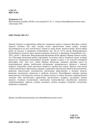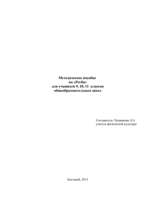 Методическое пособие по регби предназначено для учащихся 9-11 классов и направлено на популяризацию этого вида спорта в общеобразовательных школах Казахстана. Пособие включает в себя информацию об истории регби, технике безопасности, правилах игры и методических рекомендациях по физическому воспитанию через занятия регби, способствующие развитию физических и нравственных качеств у детей. Основная цель программы - вовлечение школьников в регулярные занятия спортом и подготовка к участию в соревнованиях на разных уровнях.