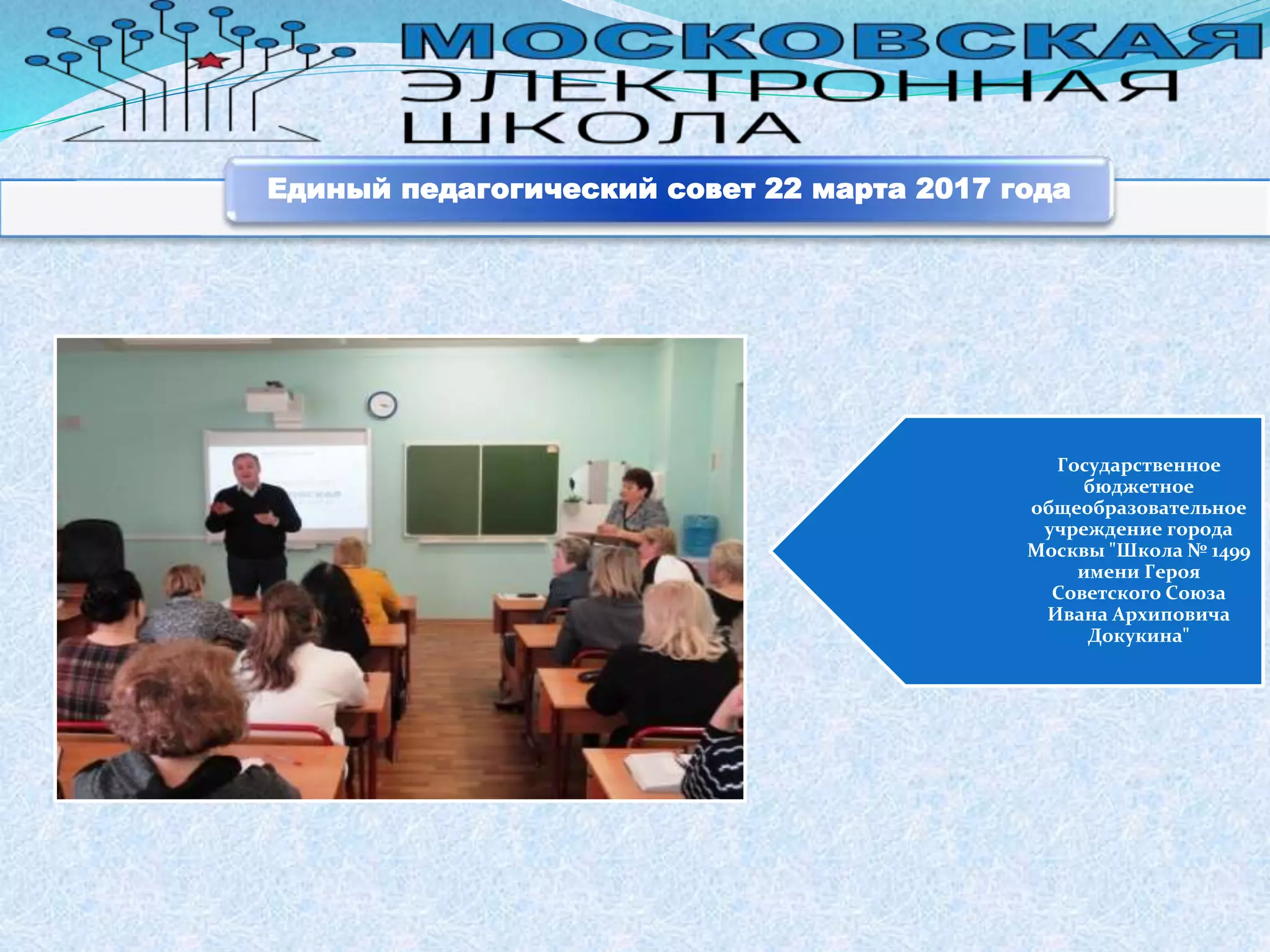 Документ описывает единый педагогический совет, который проходил 22 марта 2017 года в государственном бюджетном общеобразовательном учреждении города Москвы 'Школа No 1499 имени героя Советского Союза Ивана Архиповича Докукина'. Данный совет собрал педагогов для обсуждения актуальных вопросов и инициатив. Повторяющиеся упоминания подчеркивают важность события для образовательного процесса школы.