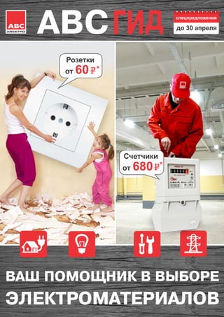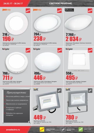 Документ представляет собой рекламный каталог с акциями и специальными предложениями на товары для освещения и электрики, действительными с 24 марта по 30 апреля 2017 года. В каталоге представлены различные светильники, выключатели, розетки и другие электрические устройства, а также условия скидок и акции для покупателей. Информация о товарах включает их характеристики и цены, а также указания на доступность в магазине.
