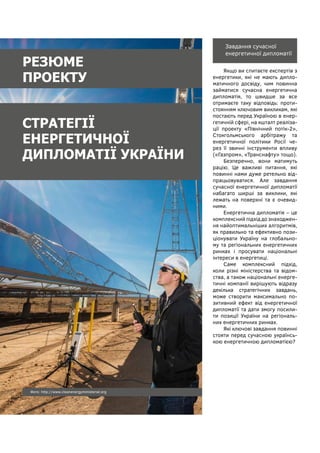Проект "Стратегії енергетичної дипломатії" аналізує можливості та перспективи посилення присутності України на глобальних та регіональних енергетичних ринках, визначає ключові можливості та виклики, а також дає чіткі рекомендації щодо посилення роботи держави на цьому напрямі