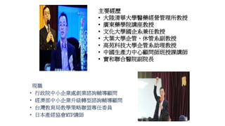 台灣教育局教學策略聯盟專任委員 • 日本產經協會MTP講師 主要經歷 ▪ 大陸清華大學醫藥經營管理所教授 ▪ 廣東藥學院講座教授 ▪ 文化大學國企系兼任教授 ▪ 大葉大學企管、休管系副教授 ▪ 高苑科技大學企管系助理教授 ▪ 中國生產力中心顧問師班授課講師 ▪ 實和聯合醫院副院長