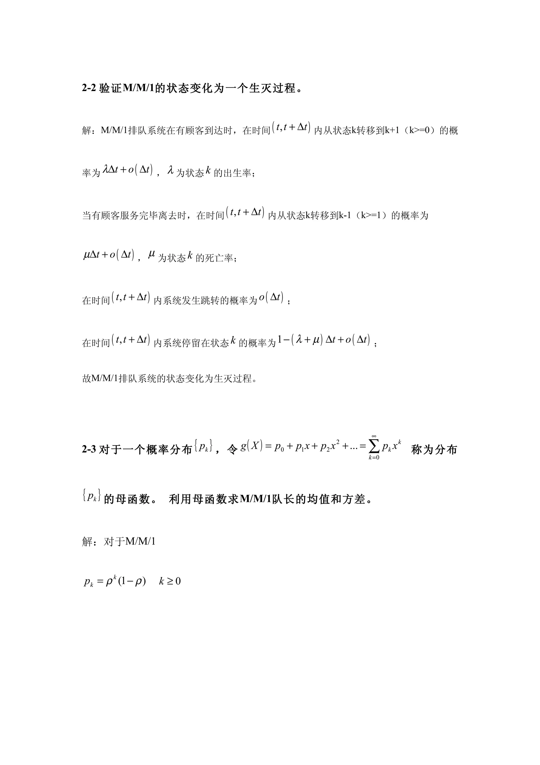 解:M/M/1排队系统在有顾客到达时,在时间( t , t + ∆t ) 内从状态k转移到k+1(k>=0)的概