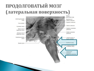 Документ представляет собой лекцию профессора Волошина о строении и функциях головного мозга, включая его развитие у различных групп животных. Описаны типы головного мозга, его анатомические отделы, основные структуры и функции. Также рассматриваются аспекты циркуляции ликвора и строение оболочек головного и спинного мозга.