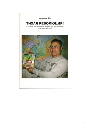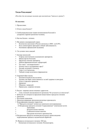 Документ является пособием по выживанию в условиях панэпидемии и рассматривает вопросы здоровья человека, влияния питания на иммунитет и основные причины заболеваний. Основное внимание уделяется вреду синтетических медицинских препаратов, пищевых суррогатов и важности функционального питания и макробиотического подхода к питанию. Автор акцентирует на необходимости осознанного выбора продуктов питания и отказа от вредных привычек для укрепления здоровья.