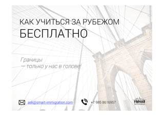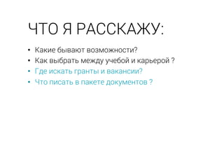 Документ представляет собой информацию о возможностях учебы и стажировок за границей, включая гранты и стипендии. В нем описываются различные форматы обучения и рекомендации по подготовке необходимых документов. Также приведены сроки подачи заявок на гранты и расписание онлайн-семинаров по теме образования и карьеры за рубежом.