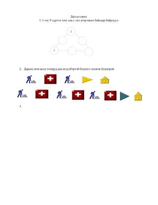 1. 1ээс 9 хүртэл тоог аль с тал дээр ижил байхаар байрлуул. 3 1 2. Дараах өгөгдөлд тохируудан өгүүлбэртэй бодлого зохиож бодоорой. 3.