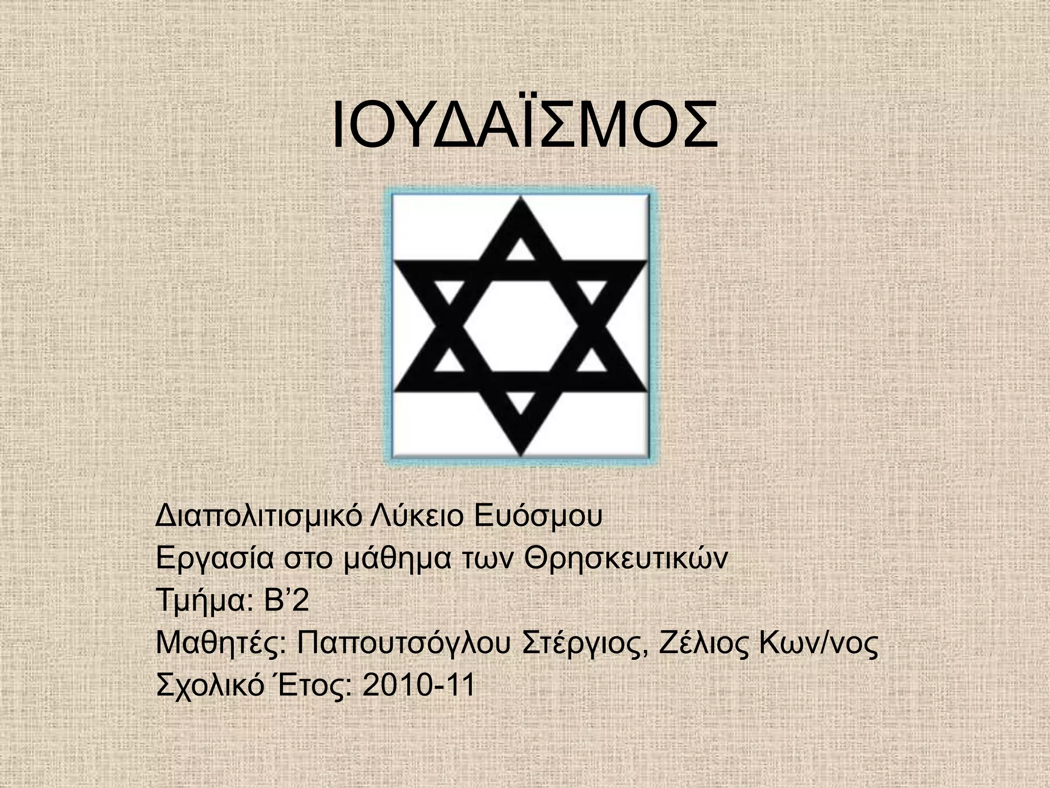 θεμέλιο Χριστιανισμούκαι ΙσλαμισμούGENIKA STOIXEIA Ο Ιουδαϊσμός είναι η θρησκεία που ασπάζεται το σύνολο του εβραϊκού λαού. Είναι η αρχαιότερη μονοθεϊστική θρησκεία, αλλά διαφέρει από τις υπόλοιπες θρησκείες, επειδή η αυθεντία δεν αποδίδεται σε κάποιο πρόσωπο, αλλά στις Γραφές και τις παραδόσεις.