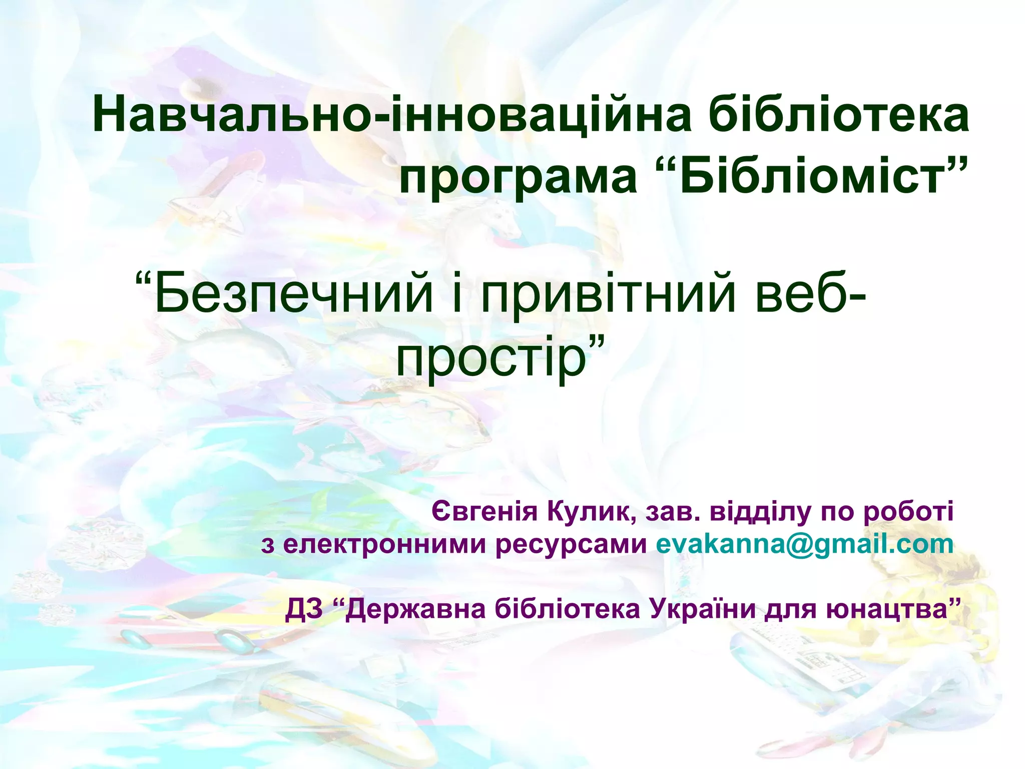 “ Безпечний іпривітний веб-простір ” Євгенія Кулик, зав. відділу по роботі з електронними ресурсами [email_address] ДЗ “Державна бібліотека України для юнацтва” Навчально-інноваційна бібліотека програм a “Бібліоміст”