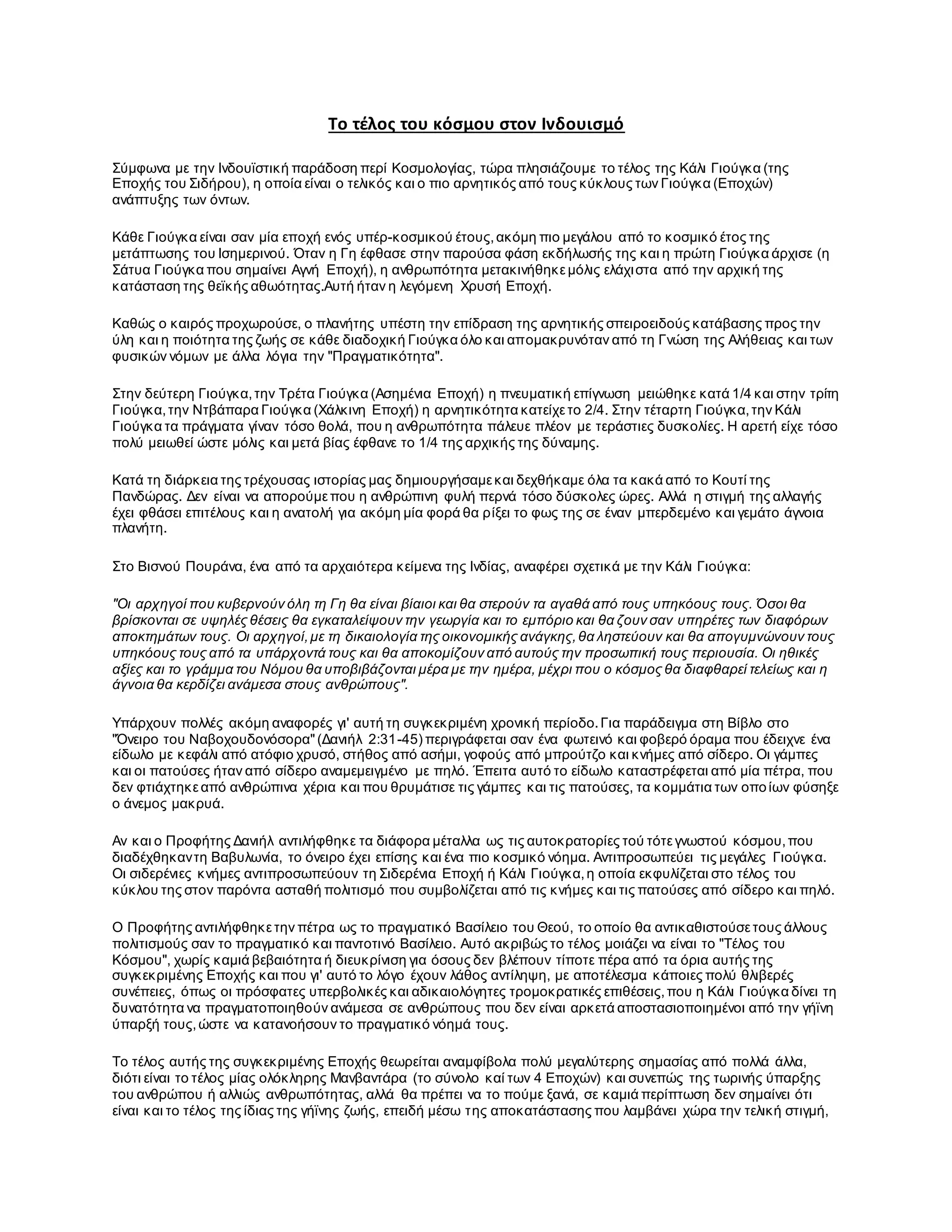 Σύμφωνα με την Ινδουϊστική παράδοση περί Κοσμολογίας, τώρα πλησιάζουμε το τέλος της Κάλι Γιούγκα (της