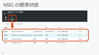 ネットワークセキュリティグループには既定のルールがあり、普段は隠されています。 「既定の規則」というボタンを押すことで隠れていたものを表示できます。 //タグの話もする。 (めくる)