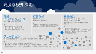 Detection Methodologies Threat Intelligence (e.g. C&C, Botnets, Known Patterns) Behavioral Analysis (e.g. Suspicious User/Process Executions) Anomaly Detections (e.g. Baselines) Detection Fusion (e.g. Kill Chain Analysis) Monitored Areas: Virtual Machine Events/ETW Network Traffic Azure Resources Audit Logs