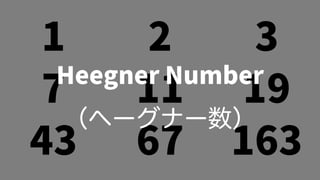 The document contains mathematical equations and discussions involving prime numbers, polynomials, and Heegner numbers. It explores properties of prime-generating polynomials and uses formulas to calculate values of eπ√d for different values of d, relating these to class numbers of imaginary quadratic fields. Bounds on Heegner numbers d are derived based on results from Heilbronn and Linfoot.