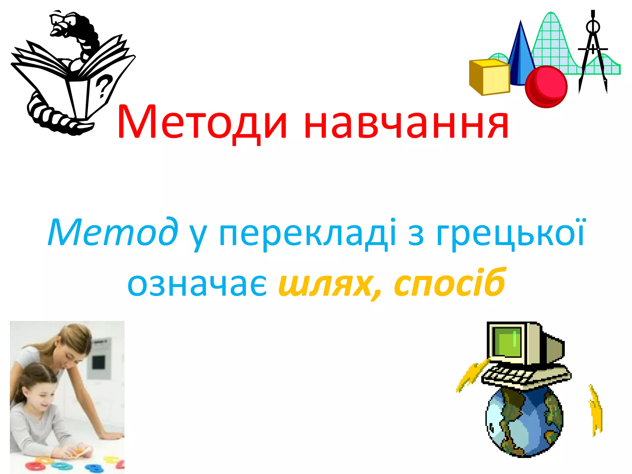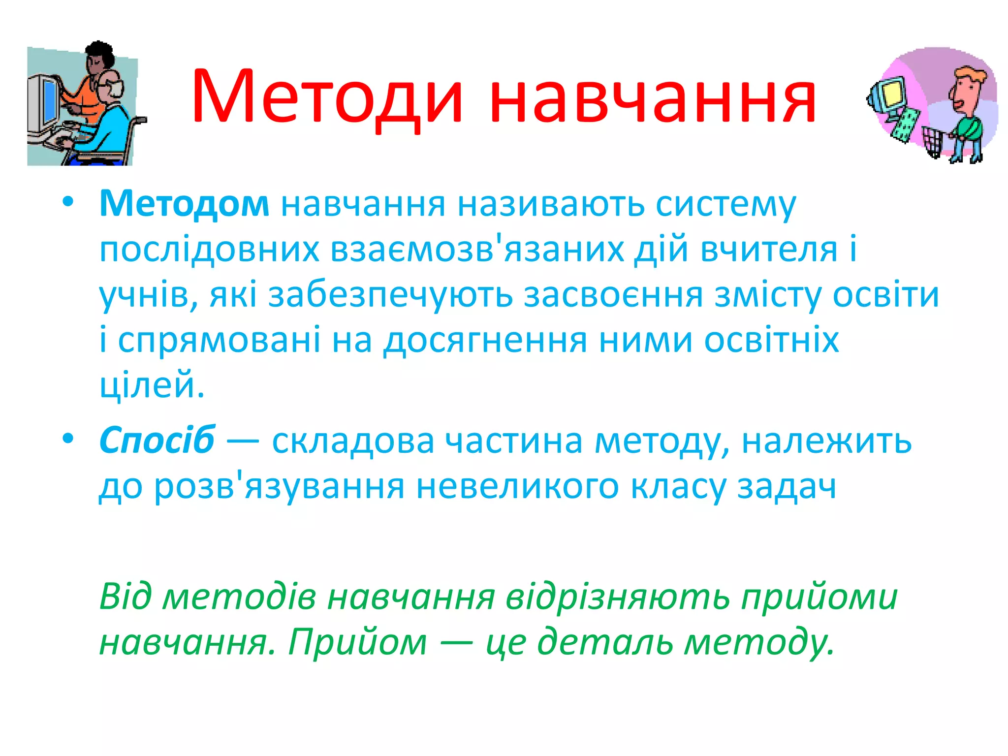 Методи навчанняМетодом навчанняназивають систему послідовних взаємозв'язаних дій вчителя і учнів, які забезпечують засвоєння змісту освіти і спрямовані на досягнення ними освітніх цілей.Спосіб— складова частина методу, належить до розв'язування невеликого класу задачВід методів навчання відрізняють прийоми навчання. Прийом — це деталь методу.