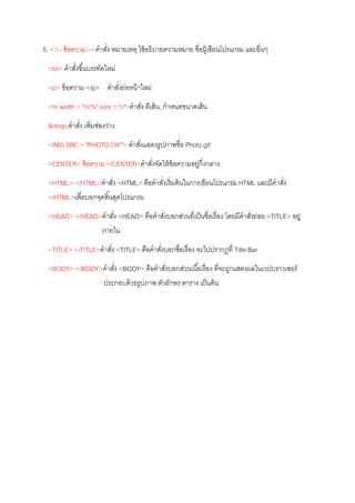 ข้อความ -->คาสั่ง หมายเหตุ ใช้อธิบายความหมาย ขื่อผู้เขียนโปรแกรม และอื่นๆ <br> คาสั่งขึ้นบรรทัดใหม่ <p> ข้อความ </p> คาสั่งย่อหน้าใหม่ <hr width = "50%" size = "3">คาสั่ง ตีเส้น, กาหนดขนาดเส้น คาสั่ง เพิ่มช่องว่าง <IMG SRC = "PHOTO.GIF"> คาสั่งแสดงรูปภาพชื่อ Photo.gif <CENTER> ข้อความ </CENTER>คาสั่งจัดให้ข้อความอยู่กึ่งกลาง <HTML> </HTML>คาสั่ง <HTML> คือคาสั่งเริ่มต้นในการเขียนโปรแกรม HTML และมีคาสั่ง </HTML>เพื่อบอกจุดสิ้นสุดโปรแกรม <HEAD> </HEAD>คาสั่ง <HEAD> คือคาสั่งบอกส่วนที่เป็นชื่อเรื่อง โดยมีคาสั่งย่อย <TITLE> อยู่ ภายใน <TITLE> </TITLE>คาสั่ง <TITLE> คือคาสั่งบอกชื่อเรื่อง จะไปปรากฏที่ Title Bar <BODY> </BODY>คาสั่ง <BODY> คือคาสั่งบอกส่วนเนื้อเรื่อง ที่จะถูกแสดงผลในเวปบราวเซอร์ ประกอบด้วยรูปภาพ ตัวอักษร ตาราง เป็นต้น