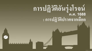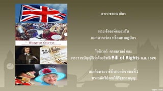 และสภาสามัญ ทา ให้อานาจสิทธิ์ขาดของ กษัตริย์ลดลง ค.ศ. 1688 รัฐสภาและประชาชน ร่วมกันก่อกาขับกษัตริย์ออกจาก ราชบัลลังก์ และให้กษัตริย์ พระองค์ใหม่ยอมรับอานาจ รัฐสภา ค.ศ.1689 ประกาศ พรบ.ว่าด้วยสิทธิ (Bill of Rights) สิทธิและ เสรีภาพ เหตุการณ์นาไปสู่ปฏิวัติอันรุ่งโรจน์ ค.ศ. 1649-1659 อังกฤษปกครอง ด้วยระบอบ สาธารณรัฐ โดยครอมเวลล์ ค.ศ. 1688 เกิด การฟื้นฟู ระบบกษัตริย์ ขึ้นมาอีกครั้ง การปฏิวัติอัน รุ่งโรจน์ โดยใช้ ระบอบ ประชาธิปไตย อย่างสมบูรณ์