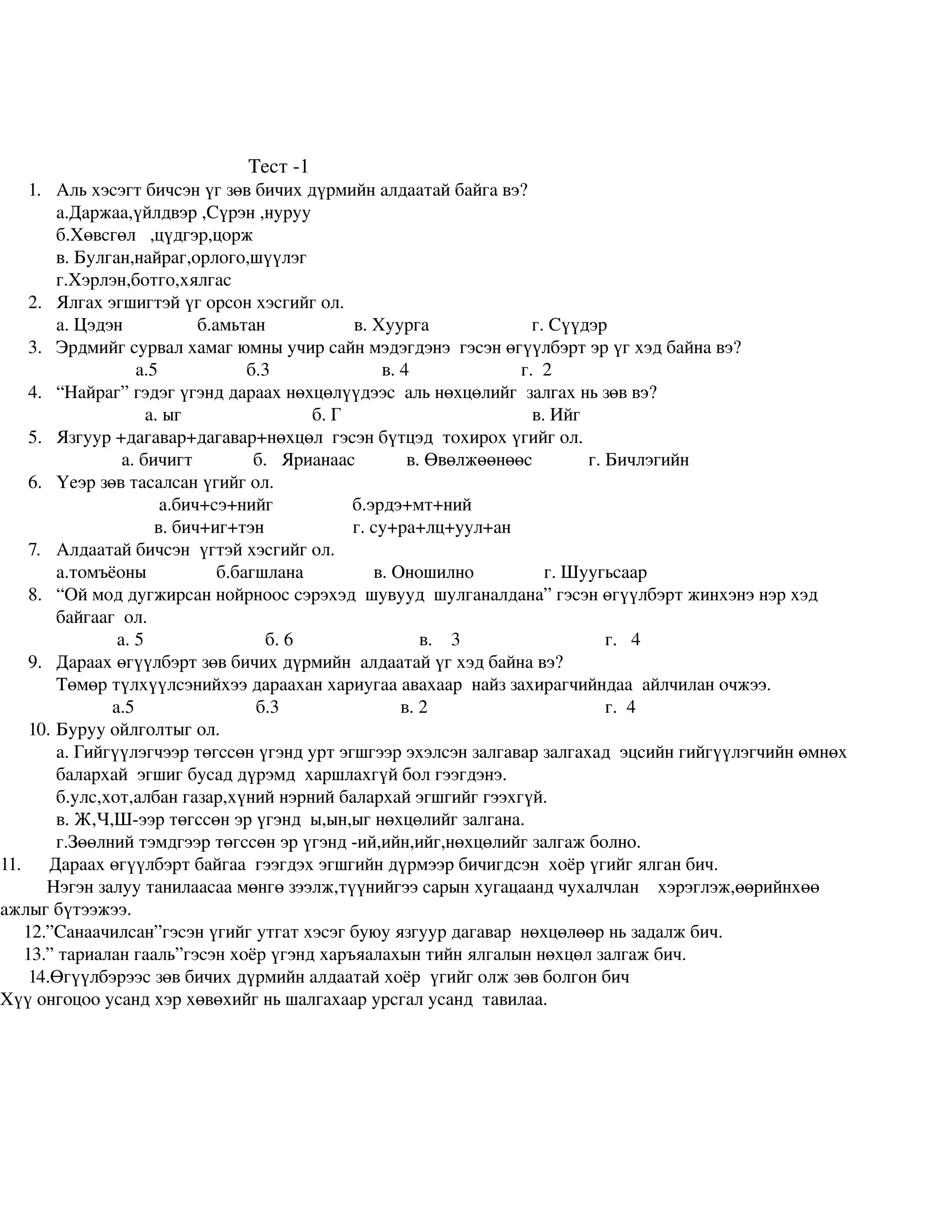 1. Аль хэсэгт бичсэн үг зөв бичих дүрмийн алдаатай байга вэ? а.Даржаа,үйлдвэр ,Сүрэн ,нуруу б.Хөвсгөл ,цүдгэр,цорж в. Булган,найраг,орлого,шүүлэг г.Хэрлэн,ботго,хялгас 2. Ялгах эгшигтэй үг орсон хэсгийг ол. а. Цэдэн б.амьтан в. Хуурга г. Сүүдэр 3. Эрдмийг сурвал хамаг юмны учир сайн мэдэгдэнэ гэсэн өгүүлбэрт эр үг хэд байна вэ? а.5 б.3 в. 4 г. 2 4. “Найраг” гэдэг үгэнд дараах нөхцөлүүдээс аль нөхцөлийг залгах нь зөв вэ? а. ыг б. Г в. Ийг 5. Язгуур +дагавар+дагавар+нөхцөл гэсэн бүтцэд тохирох үгийг ол. а. бичигт б. Ярианаас в. Өвөлжөөнөөс г. Бичлэгийн 6. Үеэр зөв тасалсан үгийг ол. а.бич+сэ+нийг б.эрдэ+мт+ний в. бич+иг+тэн г. су+ра+лц+уул+ан 7. Алдаатай бичсэн үгтэй хэсгийг ол. а.томъёоны б.багшлана в. Оношилно г. Шуугьсаар 8. “Ой мод дугжирсан нойрноос сэрэхэд шувууд шулганалдана” гэсэн өгүүлбэрт жинхэнэ нэр хэд байгааг ол. а. 5 б. 6 в. 3 г. 4 9. Дараах өгүүлбэрт зөв бичих дүрмийн алдаатай үг хэд байна вэ? Төмөр түлхүүлсэнийхээ дараахан хариугаа авахаар найз захирагчийндаа айлчилан очжээ. а.5 б.3 в. 2 г. 4 10. Буруу ойлголтыг ол. а. Гийгүүлэгчээр төгссөн үгэнд урт эгшгээр эхэлсэн залгавар залгахад эцсийн гийгүүлэгчийн өмнөх балархай эгшиг бусад дүрэмд харшлахгүй бол гээгдэнэ. б.улс,хот,албан газар,хүний нэрний балархай эгшгийг гээхгүй. в. Ж,Ч,Шээр төгссөн эр үгэнд ы,ын,ыг нөхцөлийг залгана. г.Зөөлний тэмдгээр төгссөн эр үгэнд ий,ийн,ийг,нөхцөлийг залгаж болно. 11. Дараах өгүүлбэрт байгаа гээгдэх эгшгийн дүрмээр бичигдсэн хоёр үгийг ялган бич. Нэгэн залуу танилаасаа мөнгө зээлж,түүнийгээ сарын хугацаанд чухалчлан хэрэглэж,өөрийнхөө ажлыг бүтээжээ. 12.”Санаачилсан”гэсэн үгийг утгат хэсэг буюу язгуур дагавар нөхцөлөөр нь задалж бич. 13.” тариалан гааль”гэсэн хоёр үгэнд харъяалахын тийн ялгалын нөхцөл залгаж бич. 14.Өгүүлбэрээс зөв бичих дүрмийн алдаатай хоёр үгийг олж зөв болгон бич Хүү онгоцоо усанд хэр хөвөхийг нь шалгахаар урсгал усанд тавилаа.