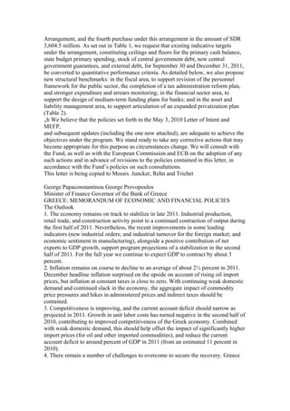 This letter from Greek Finance Minister George Papaconstantinou requests completion of the third review and approval of additional funds under Greece's IMF bailout program. It summarizes recent progress made in meeting fiscal and structural reform targets. It also lays out plans to finalize a medium-term budget strategy by April to further reduce Greece's deficit in a sustainable manner, including sector-specific reform plans to achieve an additional 8% of GDP in savings by 2014. The letter requests conversion of existing targets to performance criteria and proposes new structural benchmarks to support public sector reforms, tax administration, bank funding plans, and privatization.