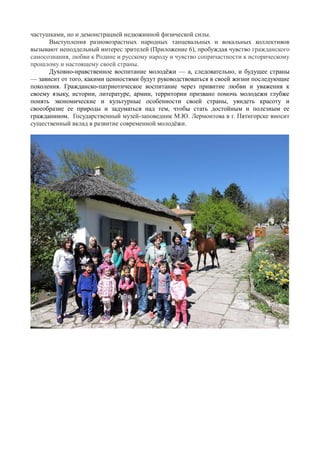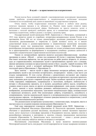 Государственный музей-заповедник М.Ю. Лермонтова в Пятигорске активно участвует в духовно-нравственном и патриотическом воспитании молодежи через интерактивные программы и мероприятия, направленные на знакомство с культурным наследием и историей. Музей предлагает разнообразные занятия для детей различных возрастов, включая экскурсии, мастер-классы и празднование традиционных событий, таких как Масленица. Основная цель этих инициатив заключается в формировании патриотических чувств и гражданского сознания у подрастающего поколения.