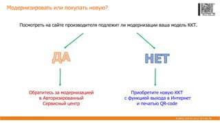 Документ описывает порядок применения контрольно-кассовой техники (ККТ), включая модернизацию старых моделей и покупку новых устройств, пригодных для работы в интернете с функцией печати QR-кодов. Также предоставлены детали о процессе модернизации, характеристиках различных моделей онлайн-касс и способах их регистрации через личные кабинеты. Представлены контактные данные руководителя центра технического обслуживания для получения дополнительной информации.