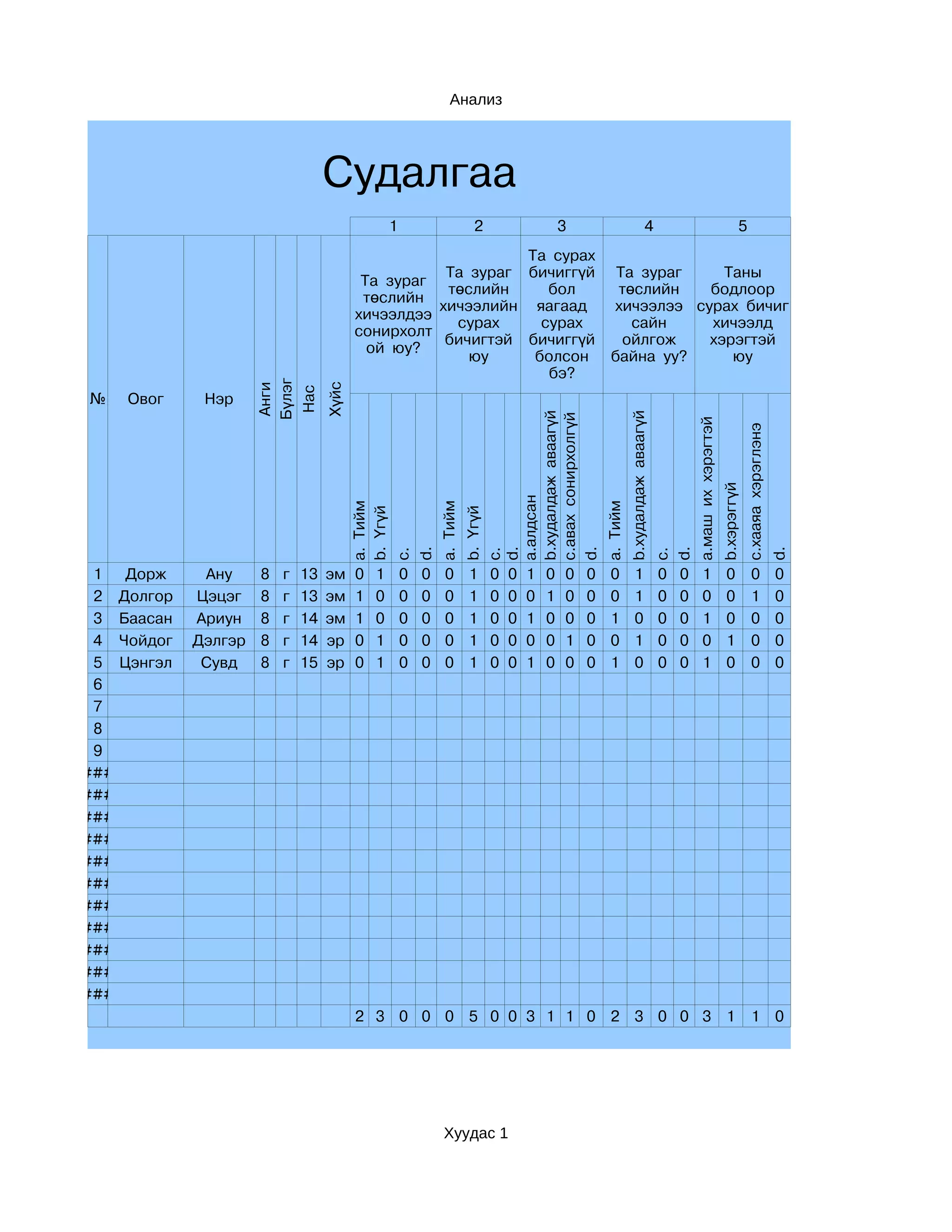 2 Долгор Цэцэг 8 г 13 эм 1 0 0 0 0 1 0 0 0 1 0 0 0 1 0 0 0 0 1 0