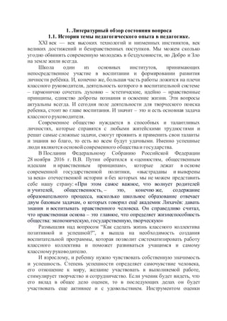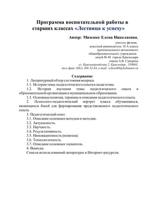 Документ представляет собой программу воспитательной работы в старших классах под названием «лестница к успеху», разработанную классным руководителем 10 А класса. Программа включает литературный обзор, психолого-педагогический портрет класса и описание методов воспитания, ориентированных на развитие личностного потенциала учащихся и повышение их социальной активности. Основная цель программы — создание гуманистического воспитательного пространства, способствующего формированию конкурентоспособной и разносторонне развитой личности.
