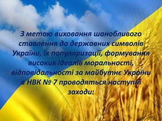 шанобливого ставлення до державних символів України, їх популяризації, формування високих ідеалів моральності, відповідальності за майбутнє України в НВК № 7 проводяться наступні заходи: