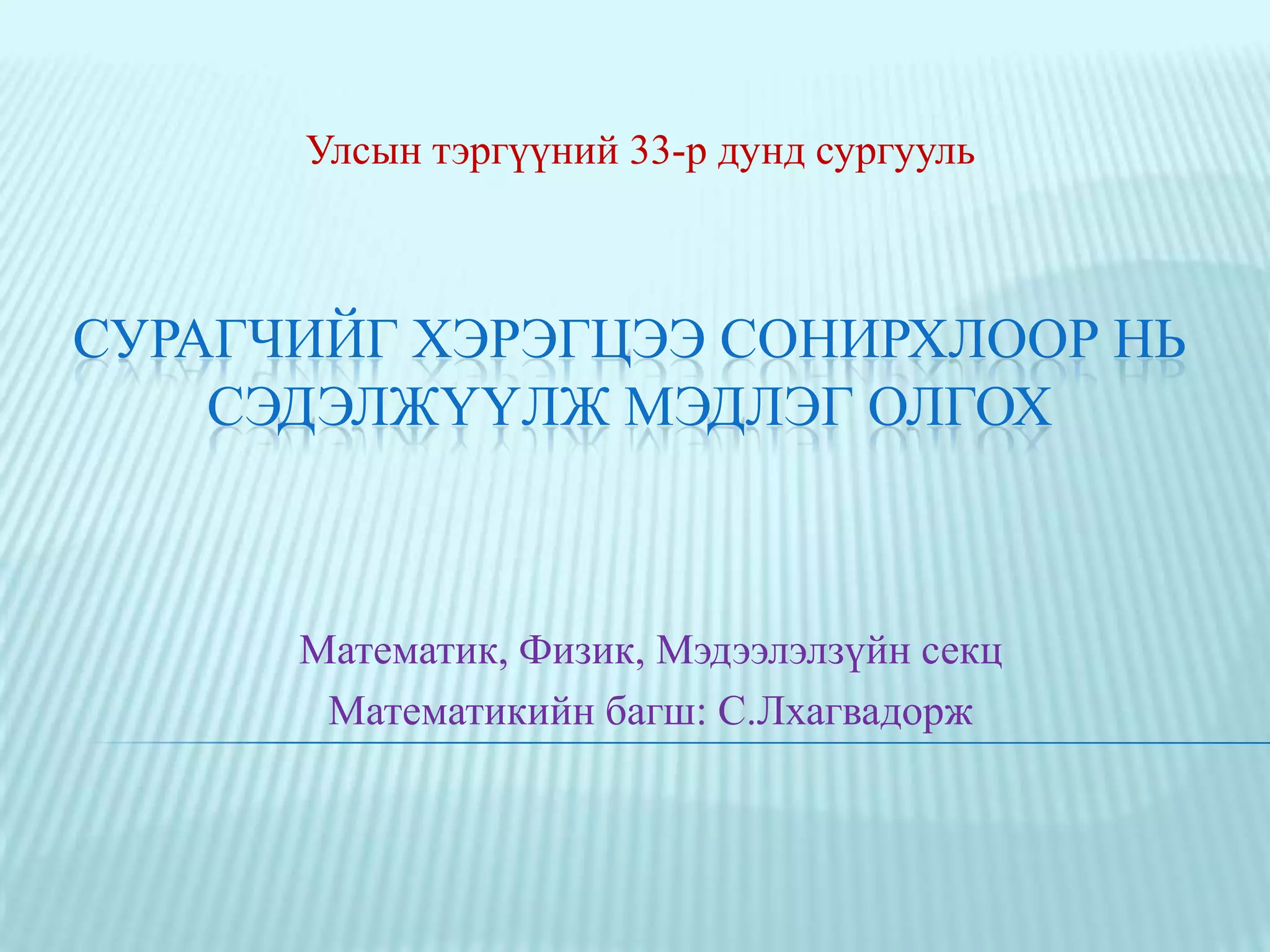 Улсын тэргүүний 33-рдунд сургууль СУРАГЧИЙГ ХЭРЭГЦЭЭ СОНИРХЛООР НЬ СЭДЭЛЖҮҮЛЖ МЭДЛЭГ ОЛГОХ Математик, Физик, Мэдээлэлзүйн секцМатематикийн багш: С.Лхагвадорж - 2.