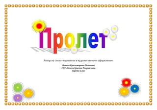 <br />Автор на стихотворението и художественото оформление:<br />Венеса Красимирова ПетковаСОУ,,Летец Христо Топракчиевтрети клас <br /> Звънко по капчука пролетта зачука.<br />6747998-45427902968625-4542790<br />24409400<br /> Чуха я тревите и размятаха косите.<br />621030-2329180<br />Чуха ги цветята и изпъстриха полята.<br /> Птиците ги чуха и от юг долетяха.<br />803275-4737100<br />770695255416<br />3951605381635<br />499832974002<br />Децата ги видяха и пролетни песни запяха.<br />