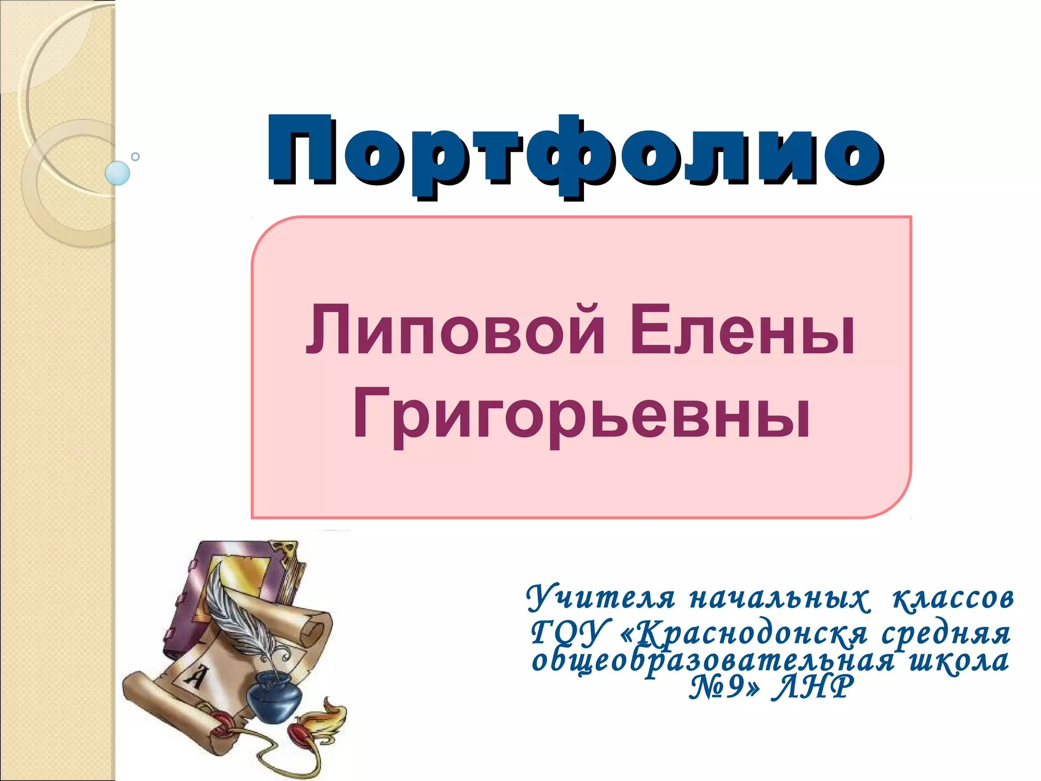 Портфолио учителя начальных классов Липовой Елены Григорьевны включает информацию о ее образовании, квалификациях, научно-методической и педагогической деятельности за 20 лет. В документе отражены достижения учащихся в конкурсах и олимпиадах, а также различные внеурочные мероприятия, в которых активно участвуют дети. Учитель разработал методы, способствующие развитию познавательного интереса у школьников через проблемно-диалогическое обучение.