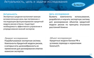 Исследование посвящено разработке экспертной системы для ранжирования кредитных моделей рисков в банках России, с акцентом на использование экспертных оценок. Целью работы является выявление компонентов, влияющих на управление и упорядочивание мнений экспертов в контексте нормативов Базель 2/3. Разработанная система позволяет эффективно вычислять медиану Кемени и обращает внимание на важность мнения авторитетного эксперта в принятии решений.