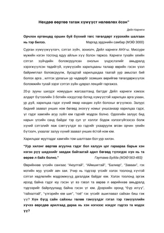 хүмүүст нөлөөлөх ёсон” Дейл Карнеги Орчлон ертөнцөд оршин буй бүхний төгс төгөлдөрт хүрэхийн шалгаан нь тэр билээ. Маргад эрдэнийн самбар (МЭӨ 3000) Сурган хүмүүжүүлэгч, сэтгэл зүйч, зохиолч, Дейл карнеги АНУ-ы. Миссури мужийн нэгэн тосгонд ядуу айлын хүү болон төржээ. Карнеги тухайн үеийн сэтгэл зүйчдийн боловсруулсан онолын үндэслэлийг амьдралд хэрэгжүүлсэн төдийгүй, хүмүүсийн харилцааны талаар өөрийн гэсэн үзэл байримтлал боловсруулж, бусадтай харилцахдаа таатай уур амьсгал бий болгох арга , илтгэх урлагын ур чадварбг эзэмших өөрийгөө төгөлдөржүүлэх боломжийн тухай зэрэг сэтгэл зүйн цуврал лекцийг гаргажээ. 20-р зууны шилдэг номуудын жагсаалтанд багтдаг Дейл карнеги хэмээх алдарт бүтээлийн 3 ботийн нэгдүгээр ботид хүмүүстэй харилцах арга ухаан, ур дүй, харилцаа гэдэг хүний ямар нандин зүйл болохыг өгүүлжээ. Залуус бидний заавал унших ном бөгөөд энэхүү номыг уншсанаар харилцаа гэдэг, үг гэдэг хамгийн агуу зүйл юм гэдгийг мэдрэх болно. Одоогийн залуус бид нарын үгсийн санд байдаг тэр сул үг хэллэг бодож хэлээгүйгээсээ болж хүний сэтгэлийг яаж сэвтүүлдэг вэ гэдгийг ухааруулж өгсөн орчин үеийн бүтээлч, ухаалаг залуу хүний заавал унших ёстой ном юм. Харилцааг муутгадаг хамгийн том шалтгаан бол уур хилэн. “Уур хилэнг өөртөө агуулна гэдэг бол халуун цог гараараа барьж хэн нэгэн рүү шидэхийг завдаж байгаатай адил бөг өөд т үлэгдэх х үн нь та өөрөө л байх болно.” Гаутама Будда (МЭӨ 563-483) Өөрийнхөө үгсийн сангаас “Аюултай”, “Аймшигтай”, “Балиар”, “Заваан”, гэх мэтийн муу үгсийг авч хая. Учир нь тэдгээр үгсийг хэлэх тоолонд х үчтэй сэтгэл хөдлөлийн мэдрэмжүүд дагалдаж байдаг юм. Хэлэх тоолонд эргэж ирээд байна гэдэг юу гэсэн үг вэ гэвэл та өөрөө л өөрийнхөө амьдралд тэдгээрийг байрлуулаад байна гэсэн үг юм. Дээрхийн оронд “б үр ил үү”, “гайхалтай”, “үлгэрийн юм шиг”, “гоё” гэх үгсийг ашиглавал сайхан биш гэж үү? Хүн бүгд сайн сайхны төлөө тэмүүлдэг гэтэл тэр тэм үүллийн хүчээ өөрсдөө арилгаад дараа нь хэн нэгнээс нэхдэг гэдгээ та мэдэх үү?