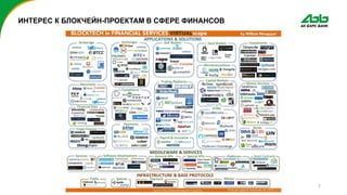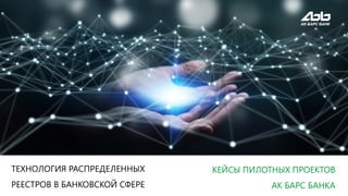 Документ обсуждает применение технологии распределенных реестров в банковской сфере с примерами пилотных проектов Ак Барс Банка. Рассматриваются возможные области использования, такие как жизненный цикл ценных бумаг и межбанковские обмены KYC-анкетами. Также упоминается о платежной инфраструктуре на базе Почты России.