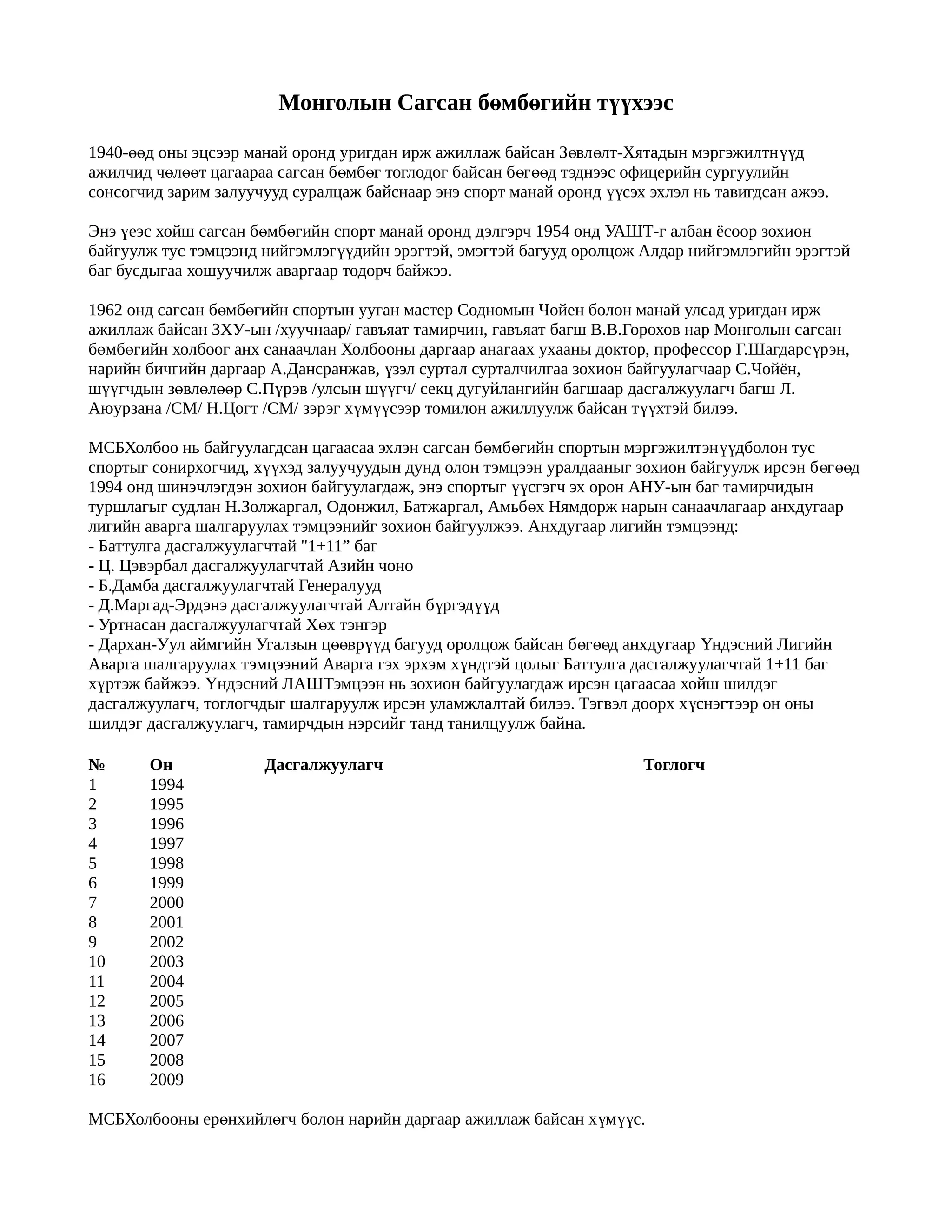 Ерөнхийлөгч ЕНБДарга 1 1962-1970 Т.Шагдарсүрэн Док.проф А.Дансранжав 2 1970 Дэмчигдорж НААҮЯ-ны сайд Д.Содномзундуй 3 1971-1990 Баасан Ганзориг 4 1990-1998 Золжаргал УИХ гишүүн Батжаргал 5 1998-2000 Баярцогт УИХ гишүүн Амьбөх 6 2000-2004 Барсболд БХЯамны сайд Маргад-Эрдэнэ 7 2004-оос одоог хүртэл Мөнх-Оргил ХЗДХ дэд сайд Б.Дашдэлгэр Монголын шигшээ багийн тамирчид 1956онд БНХАУ-ын Өв өр монголын Х өх хотноо зохиогдсон, Хятад- Монголын төмөр замчдын урлаг спортын бэсрэг наадамд оролцож анх удаа хилийн дээс алхаж хятадын баг тамирчидтай ширүүн өрсөлдөөнтэй тоглолтыг үзүүлж тунч ялимг үй оноогоор хожигдож байсан нь монголын баг тамирчид гадаадын багтай хийсэн анхны тоглолт байжээ. М өн энэ онд Киргиз ССР-н баг тамирчид манай оронд ирж нөхөрсөг уулзалт тоглолтыг хийж байжээ. МСБХолбоо нь Азийн сагсан бөмбөгийн холбооны 44 дэх гишүүнээр 2000.12.21нд, ОУСБХ-ны 144 дэх гишүүн орноор 2000.12.29-нд тус тус элсэн орсон байна. Монголын сагсан б өмб өгийн спортын мэргэжилтнүүд болон МСБХолбоо нь гадаад улс орнуудын мэргэжилтн үүдтэй хамтран ажиллах, туршлага солилцох олон талт үйл ажиллагааг явуулсаар ирсэн б өг өөд 2006 онд Солонгос улсын дасгалжуулагч Пак Сун Гин анх удаа монголд дасгалжуулагчаар 2 жилийн хугацаатайгаар ажиллахаар ирж байсан ба одоог хүртэл ажиллаж лигийн багийг дасгалжуулж олон чадварлаг тамирчидыг бэлтгэсээр байна. Мөн 2006 онд Азийн СБХолбооны комиссор шүүгч Ли Как Куан ирж монголд ОУ-ын ш үүгч, дасгалжуулагчийн семинарыг зохион байгуулсан. Энэ семинар нь 60 суралцагчаар 3 өд өр үргэлжилэн төгсөгч бүрт сертификат олгосон байна. Монголд анх 2006 онд ОУ-ын чанартай тэмцээн зохион байгуулагдсан б өг өөд тус тэмцээнд Солонгос улсын Дангүүк сургуулийн шигшээ багийн тамирчид, ОХУ-н Металлург хотын шигшээ баг, Эрх үүгийн шигшээ баг, монголын шигшээ багууд оролцож хурд хүчээ сорин өрс өлдс өн өөс тэрг үүн байрыг Солонгос, удаах байруудыг ОХУ, Монголын багууд тус тус эзэлж байжээ. Сагсан бөмбөгийн спортыг сонирхогч, тус спортоор хичээллэгчидийн тоо жил ирэх тусам өсч байгаа нь энэ спорт манай оронд хурдацтай хөгжиж байгаагийн илрэл юм. Одоогоор монголд жилд * Өсвөрийн УАШТ * Идэрчүүдийн УАШТ * Залуучуудын УАШТ * Насанд хүрэгчдийн УАШТ * Нэрэмжит тэмцээнүүд * Ахмадын УАШТ * ОУ-ын тэмцээн * Холбоодын цомын тэмцээн * Оюутны лигийн тэмцээн * Дээд лигийн тэмцээнүүд зохиогддог байна.