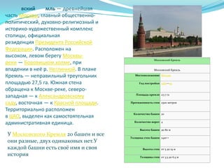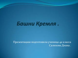 Презентация ученицы 4а класса Дианы Салиховой описывает московский Кремль, его башни и историческую значимость комплекса. Кремль имеет уникальную архитектуру, включая 20 разных башен, каждая из которых имеет свою историю и особенности. Документ раскрывает детали о различных башнях, их высоте и историческом назначении.