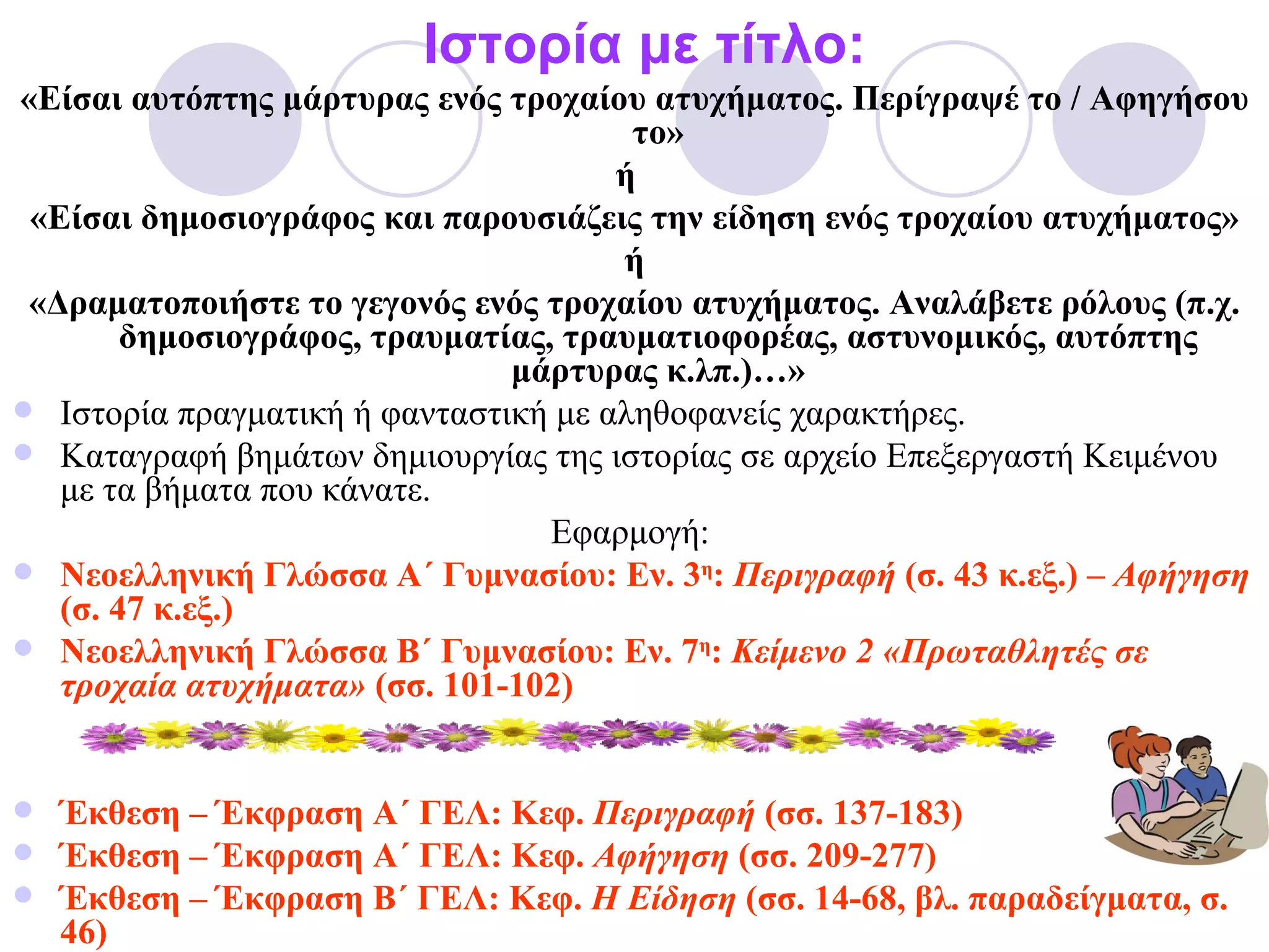 «Είσαιαυτόπτης μάρτυρας ενός τροχαίου ατυχήματος. Περίγραψέ το / Αφηγήσου το» ή «Είσαι δημοσιογράφος και παρουσιάζεις την είδηση ενός τροχαίου ατυχήματος» ή «Δραματοποιήστε το γεγονός ενός τροχαίου ατυχήματος. Αναλάβετε ρόλους (π.χ. δημοσιογράφος, τραυματίας, τραυματιοφορέας, αστυνομικός, αυτόπτης μάρτυρας κ.λπ.)…» Ιστορία πραγματική ή φανταστική με αληθοφανείς χαρακτήρες. Καταγραφή βημάτων δημιουργίας της ιστορίας σε αρχείο Επεξεργαστή Κειμένου με τα βήματα που κάνατε. Εφαρμογή: Νεοελληνική Γλώσσα Α΄ Γυμνασίου: Εν. 3 η : Περιγραφή (σ. 43 κ.εξ.) – Αφήγηση (σ. 47 κ.εξ.) Νεοελληνική Γλώσσα Β΄ Γυμνασίου: Εν. 7 η : Κείμενο 2 «Πρωταθλητές σε τροχαία ατυχήματα» (σσ. 101-102) Έκθεση – Έκφραση Α΄ ΓΕΛ: Κεφ. Περιγραφή (σσ. 137-183) Έκθεση – Έκφραση Α΄ ΓΕΛ: Κεφ. Αφήγηση (σσ. 209-277) Έκθεση – Έκφραση Β΄ ΓΕΛ: Κεφ. Η Είδηση (σσ. 14-68, βλ. παραδείγματα, σ. 46) Ιστορία με τίτλο: