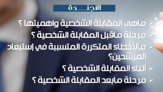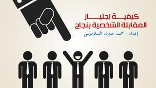 تناقش الوثيقة كيفية النجاح في مقابلات العمل من خلال مراحل ما قبل المقابلة، وأثناءها، وما بعدها. تتضمن مجموعة من النصائح والإرشادات التي تساعد المرشحين على الاستعداد والتصرف بشكل صحيح، بالإضافة إلى أهم الأخطاء التي يجب تجنبها. كما تقدم أمثلة على الأسئلة الشائعة والصعبة التي قد يواجهها المتقدمون.