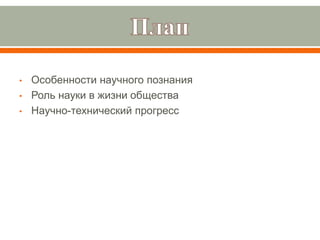 Документ обсуждает природу научного познания, его формы и методы, а также выделяет ключевые аспекты роли науки в обществе. Основное внимание уделяется различию между научным и обыденным познанием, уровням научного познания и функциям науки. Также рассматривается научно-технический прогресс как движущая сила социального и экономического развития.