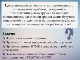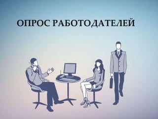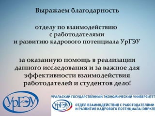 Документ содержит аналитику о состоянии рынка труда в Свердловской области на 2015-2016 годы, включая данные о соотношении занятых и безработных, а также о трудностях с трудоустройством молодых специалистов. Основное внимание уделяется ожиданиям студентов и требованиям работодателей, включая важность опыта работы и дополнительных квалификаций. Исследование подчеркивает необходимость сотрудничества между университетами и работодателями для улучшения трудовых перспектив выпускников.