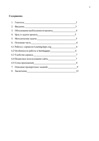 Документ описывает проект, посвященный применению ICT технологий в преподавании биологии с использованием платформы learningapps.org. Основная цель проекта заключается в повышении качества образовательного процесса за счет информатизации и использования интерактивных инструментов для создания и выполнения учебных заданий. Проект включает методические задачи, практические рекомендации по работе с сервисом и описание проверочных заданий для учащихся 6-11 классов.